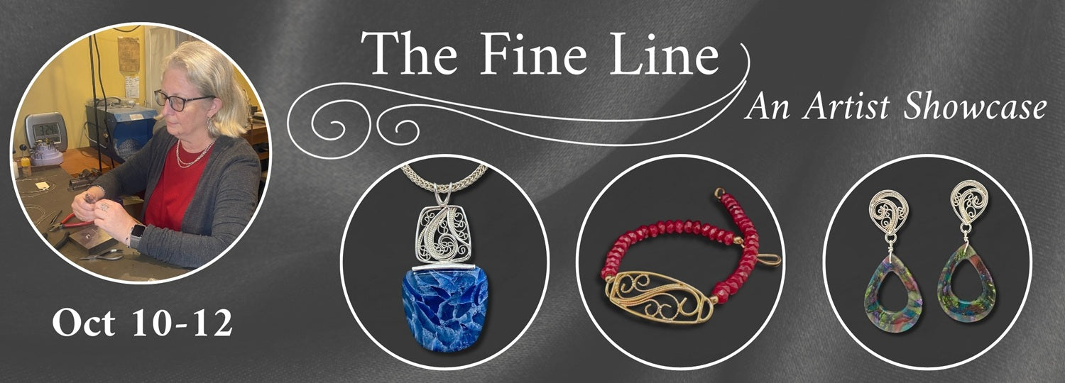 Lisa Gallagher returns to Veleska Jewelry with The Fine Line—an exhibition of her intricate filigree creations in silver and gold. Each piece balances delicate detail with striking design, making them wearable works of art.