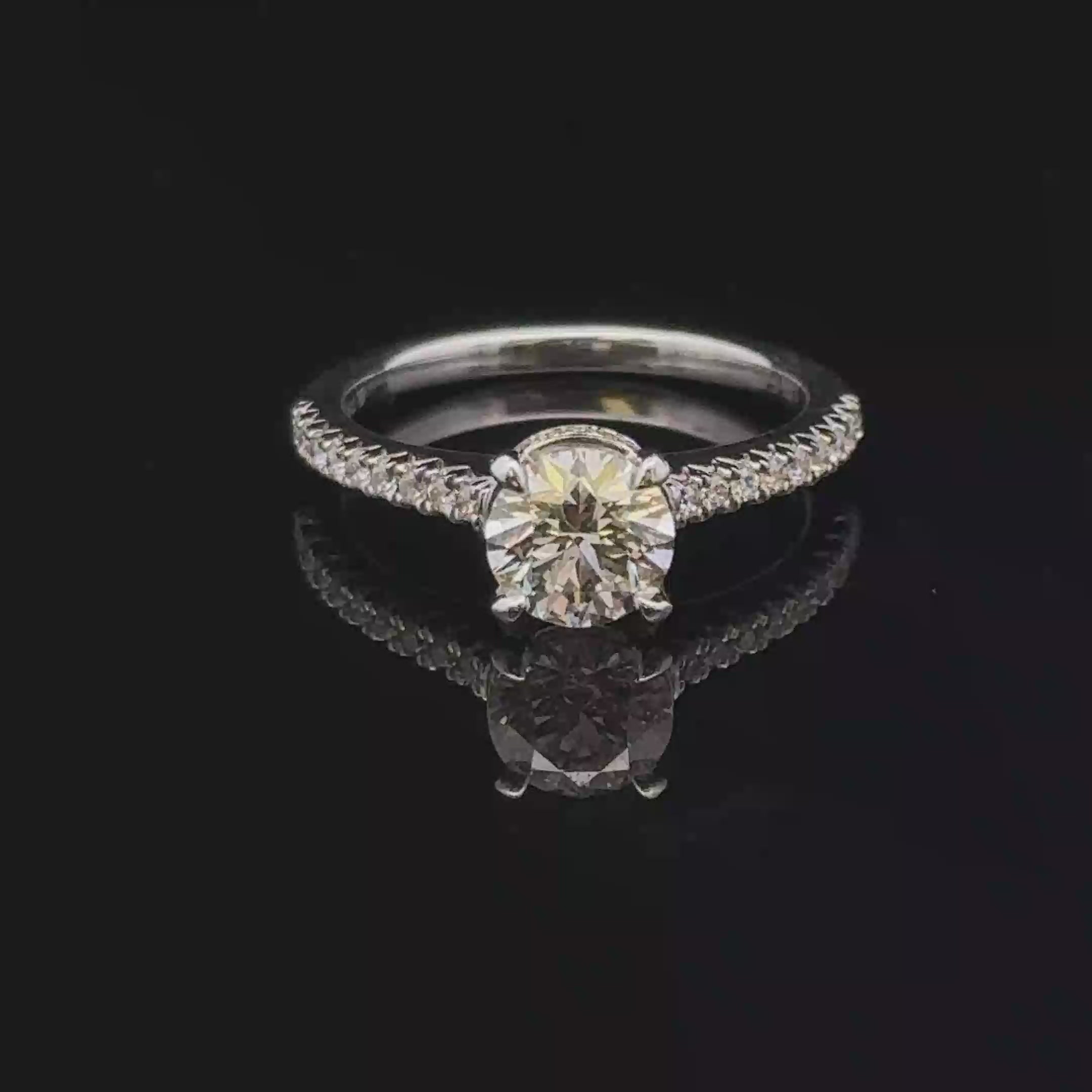 Embrace timeless elegance with the Aleizae Ring from Veleska Jewelry. This exceptional 14K white gold diamond engagement ring is a true masterpiece, designed to showcase its GIA certified .96 carat round center stone. Delicately framed by a hidden halo, the center diamond radiates with a mesmerizing sparkle that is subtly enhanced by the additional 36 diamonds totaling .20 carats that gracefully line the band. The Aleizae Ring’s fits comfortably and offers an exquisite balance of luxury and sophistication. Its hidden halo adds a touch of mystique and modern flair, making the center diamond appear larger and more luminous. The sleek design of the diamond-studded band provides a seamless sparkle that extends around the finger.