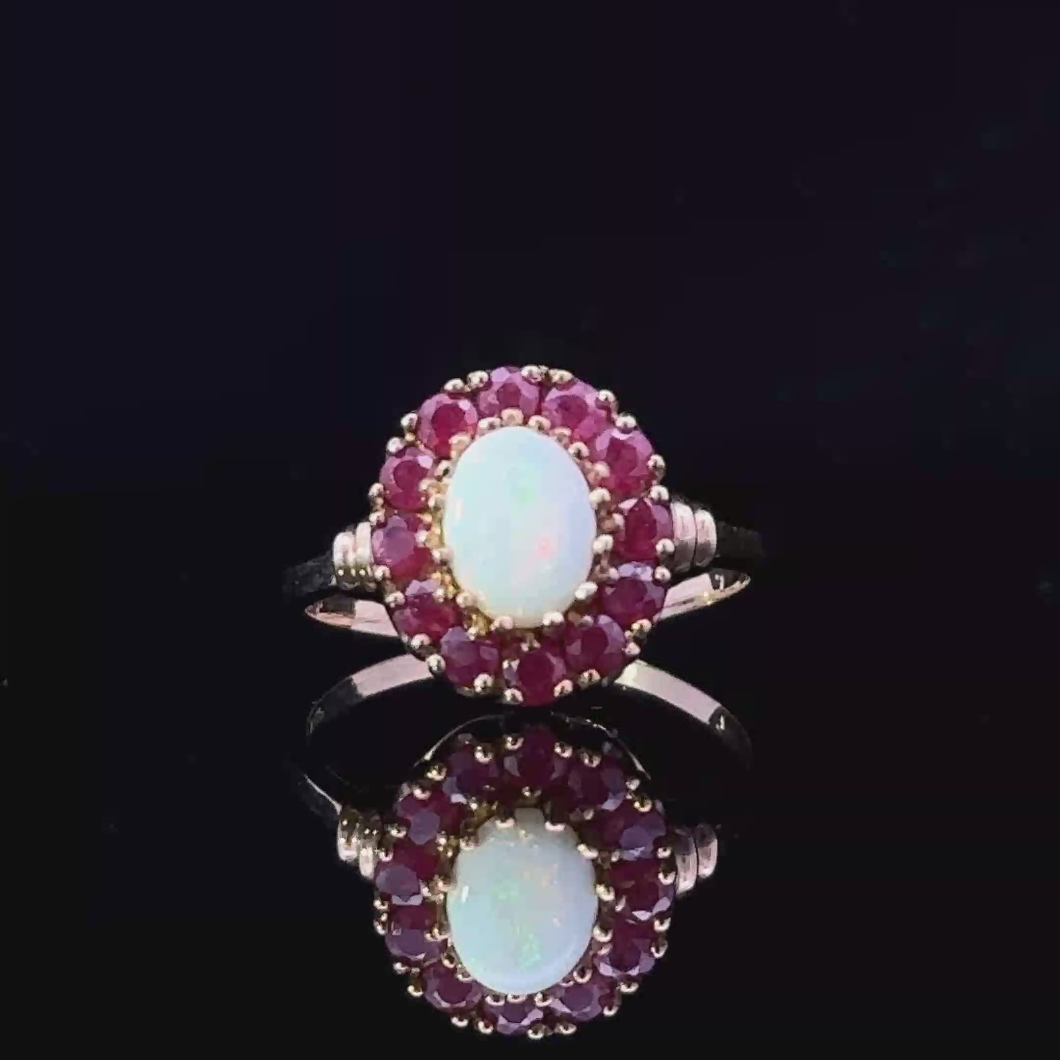 The Alexa fashion ring showcases a luminous 8x6mm oval opal at its center, radiating with iridescent hues. Surrounding it, twelve vibrant round red garnets (1.25ctw) add a striking contrast. Set in 10K yellow gold, this elegant ring has a delicate 1mm band, offering a refined and timeless look. Perfect for adding a touch of color and sophistication to any collection.