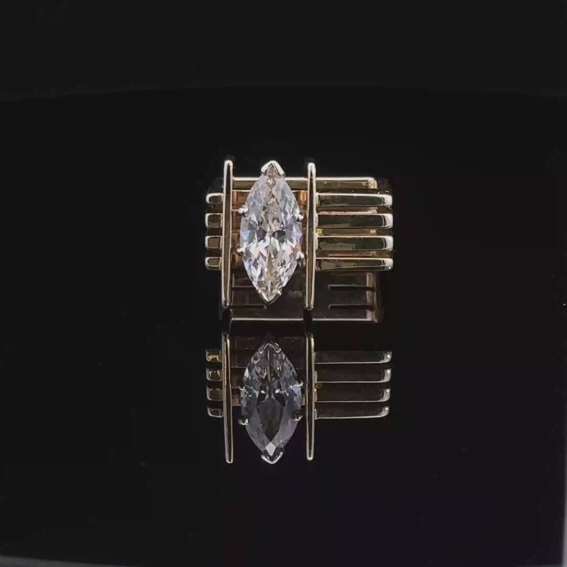 The Amaia ring features a stunning 1.87ct marquise K VS1 diamond in a modern 14K yellow gold setting. A distinctive Mid-Mod piece, perfect for standout style.