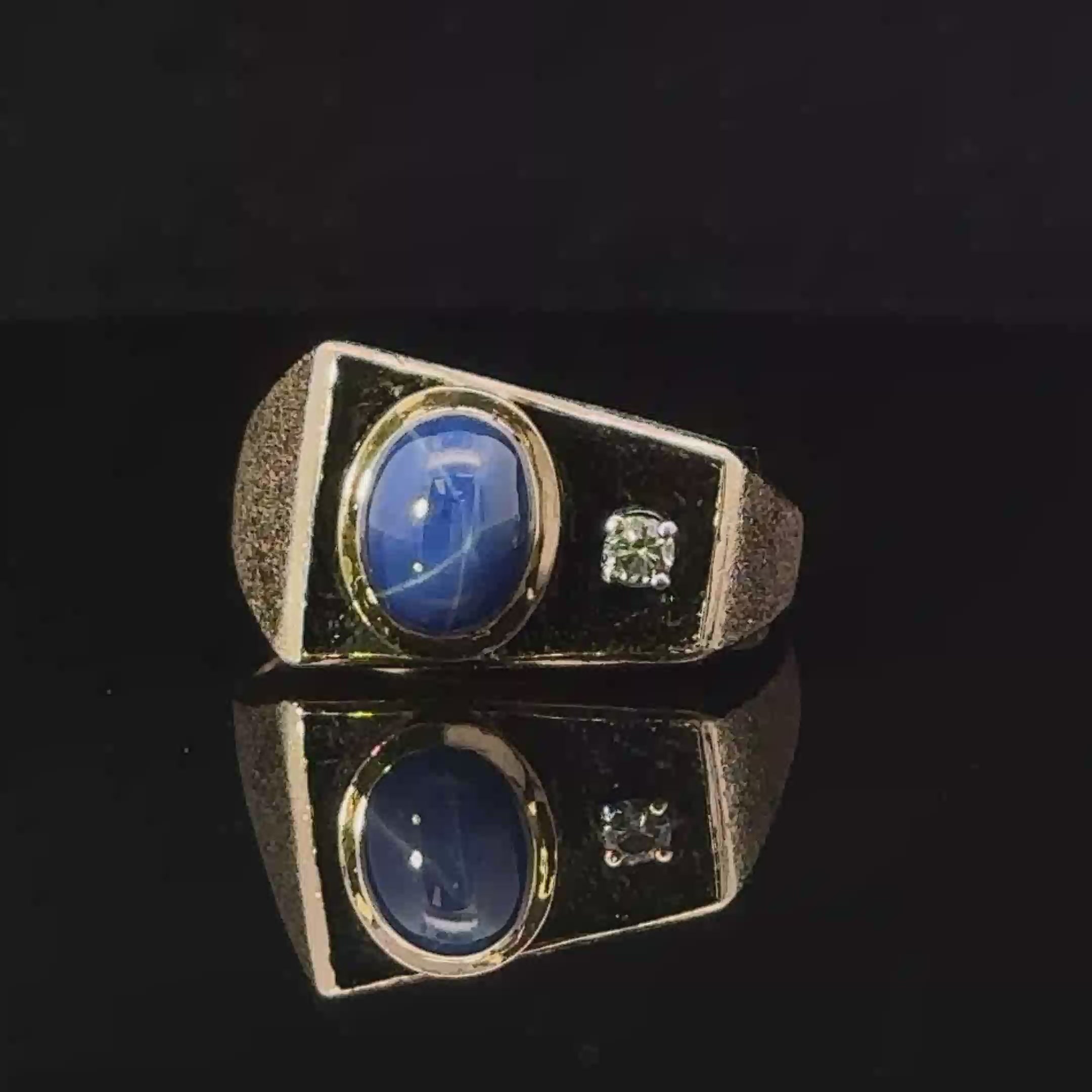 Unveil the sophistication of Veleska Jewelry's Amando Ring, a contemporary estate piece in 14K yellow gold. This exceptional ring, sized at 11, features a magnificent 2.42ct cabochon lab-created star sapphire. The sapphire's enchanting blue hue and star-like reflection are truly mesmerizing. Complementing the sapphire is a 0.07ct round diamond, artfully placed to the side for an unusual and captivating visual appeal.