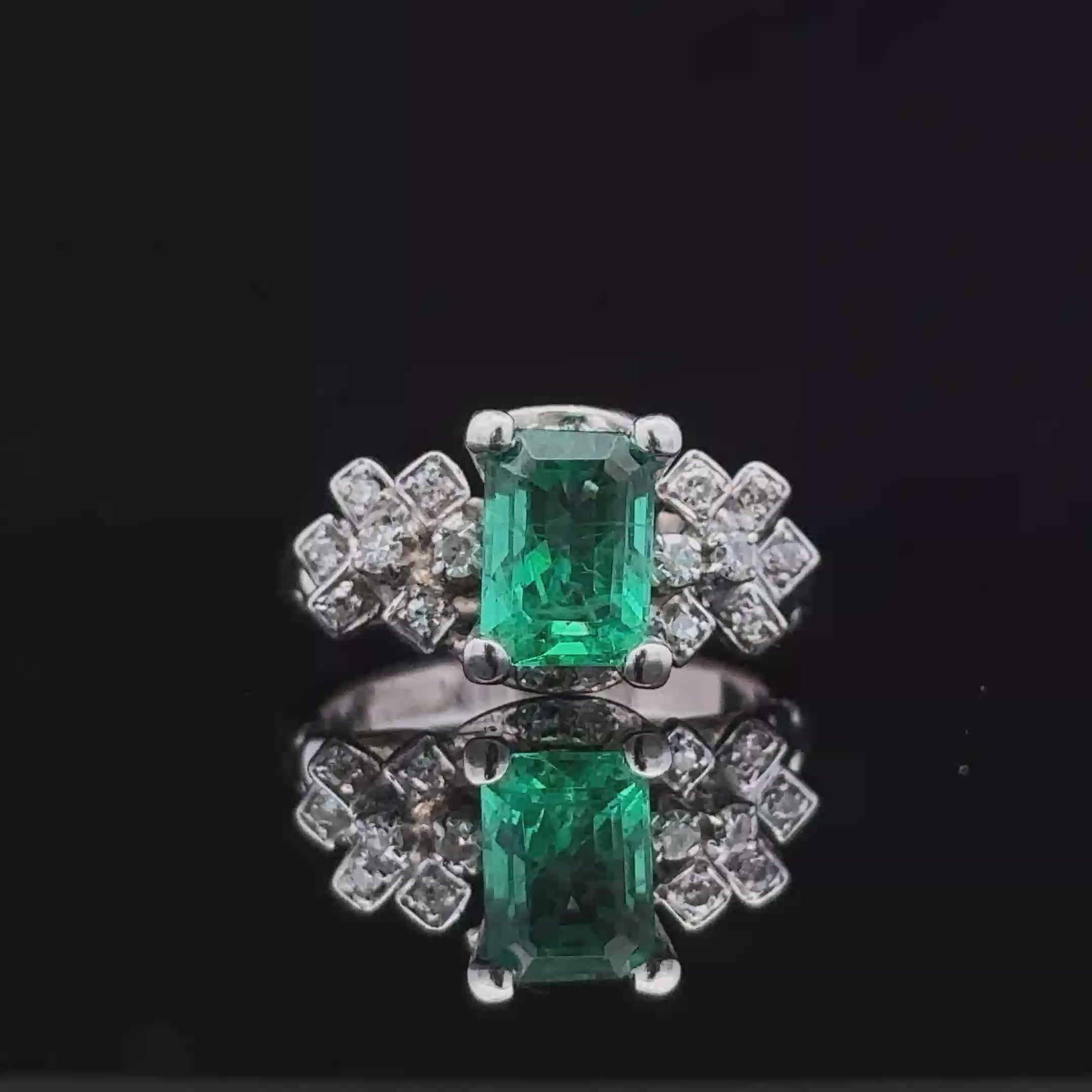The Amaris Fashion Ring is a vision of elegance, featuring a 1.46-carat emerald-cut green emerald framed by 16 sparkling diamonds totaling 0.50 carats. Set in polished 14K white gold, this ring offers timeless sophistication and vibrant brilliance.