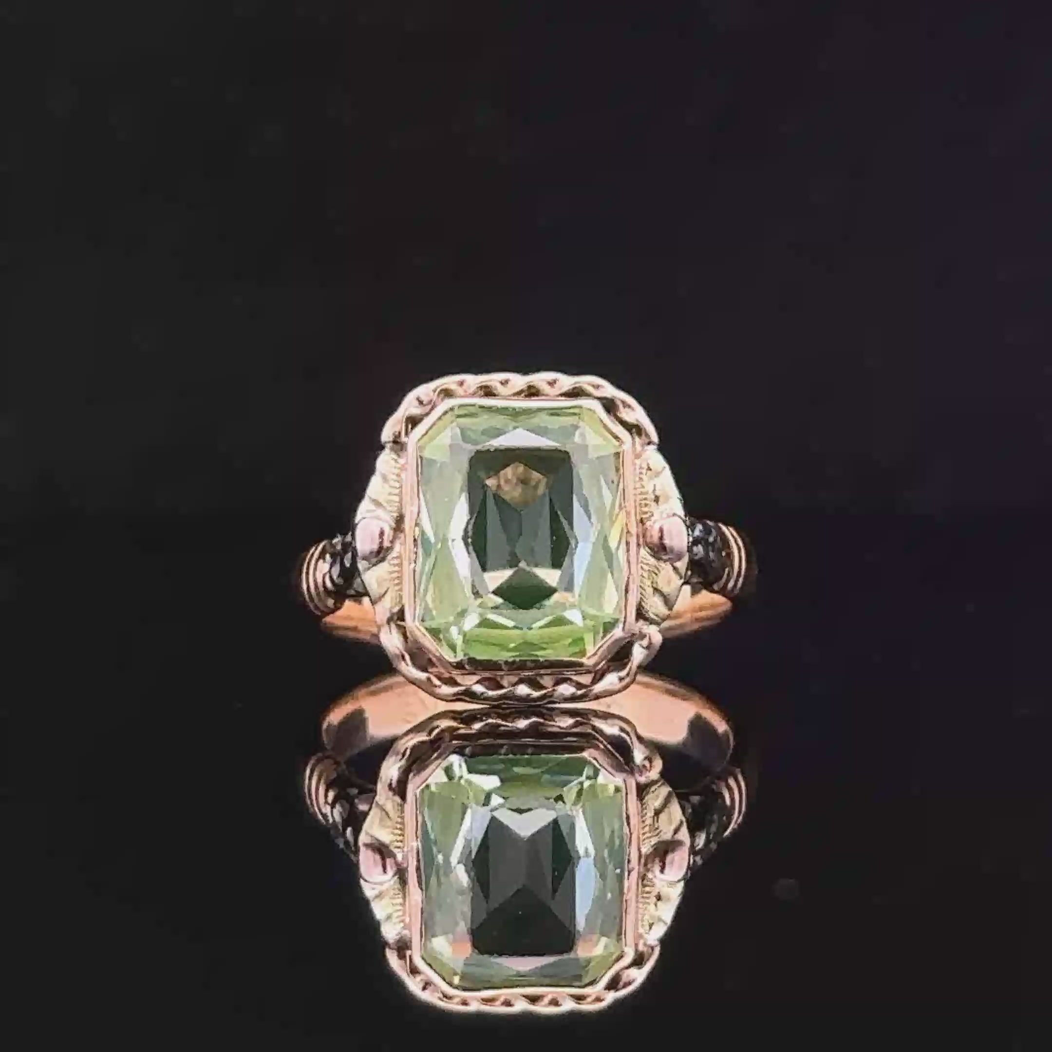 The Ansley ring showcases timeless charm with its antique-style design in 14K yellow gold. Featuring a luminous green quartz centerpiece, this ring exudes elegance and sophistication.