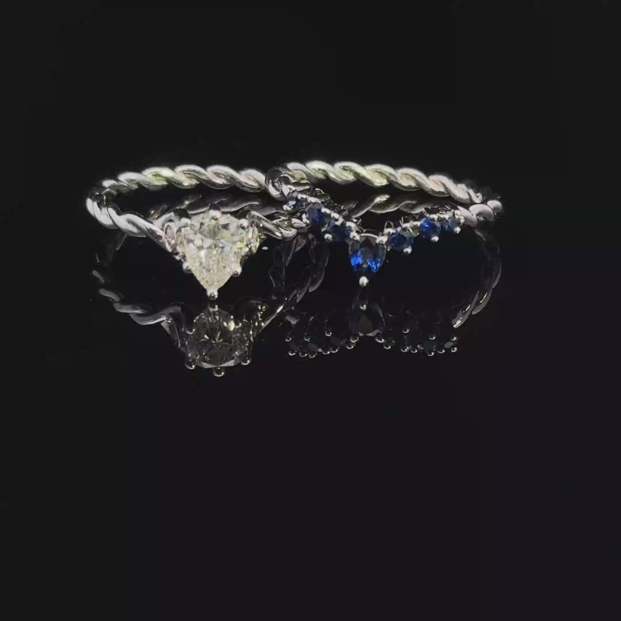 The Aquaria Ring by Veleska Jewelry is a stunning marriage of tradition and contemporary design, beautifully crafted in 14K white gold. This exquisite wedding set includes both an engagement ring and a wedding band, each designed to complement the other perfectly while standing out as individual masterpieces. The engagement ring features a striking pear-shaped diamond at its center, weighing .57 ctw. This central diamond is flanked by two additional diamonds, adding .10 ctw to the piece, for a total diamond weight of .67 ctw in the engagement ring. The elegant design and brilliant sparkle of these diamonds symbolize the strength and purity of your love. Accompanying the diamond engagement ring is a wedding band that boasts a central pear-shaped sapphire, weighing .17 ct, known for its deep, mesmerizing blue hue and symbolic meaning of wisdom and royalty. Six side stones totaling .15 ctw enhance the sapphire, completing the band with a flourish of sparkle.