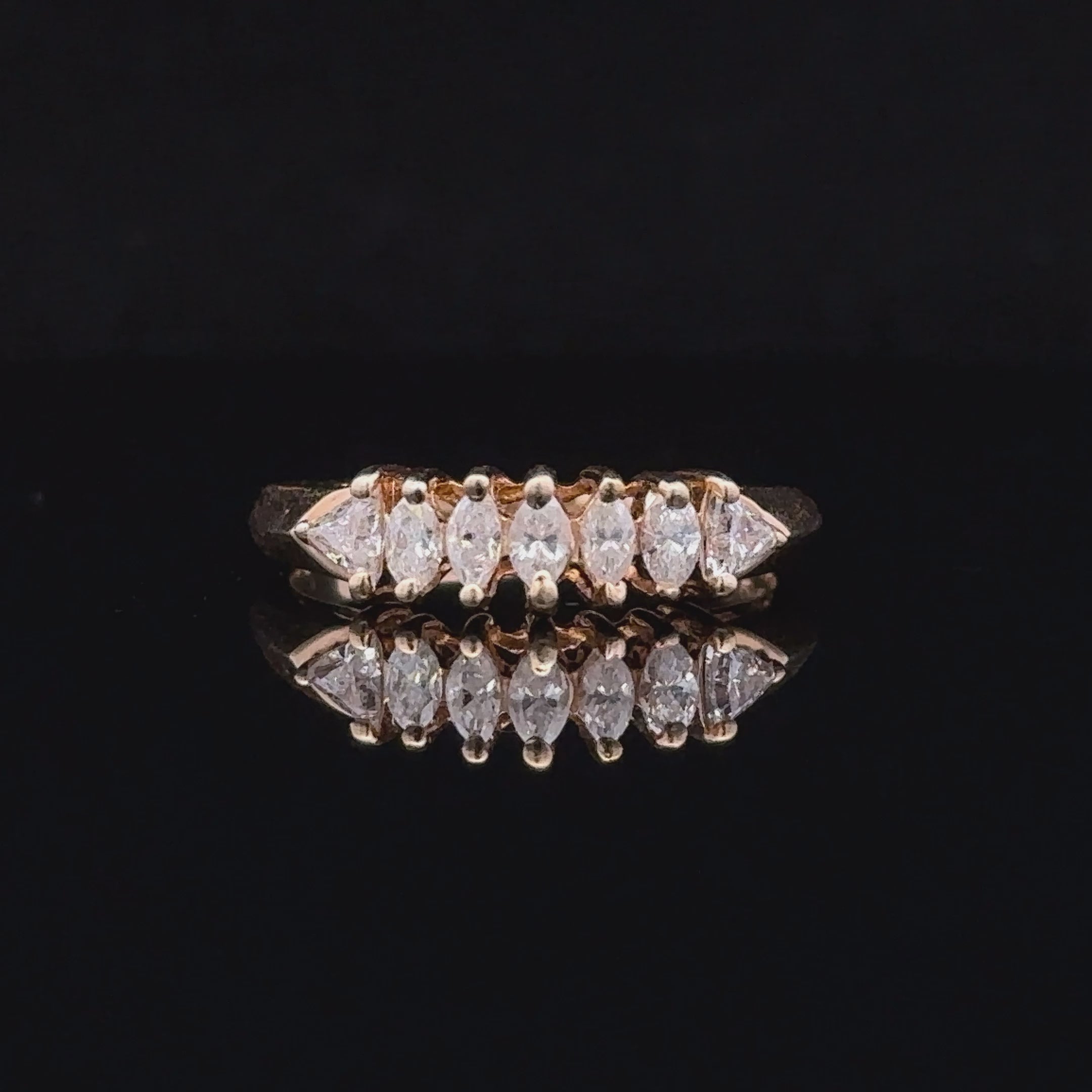 The Athena Yellow 14K Fashion Ring is a stunning blend of luxury and contemporary design. Crafted from 14K yellow gold, this elegant ring features five marquise diamonds and two trillion diamonds, all of G color and SI1 clarity, totaling 0.40 carats and 0.18 carats respectively. The unique combination of marquise and trillion cuts creates a captivating look that sparkles from every angle. The Athena ring is the perfect statement piece for those who appreciate sophisticated style and brilliant diamonds.