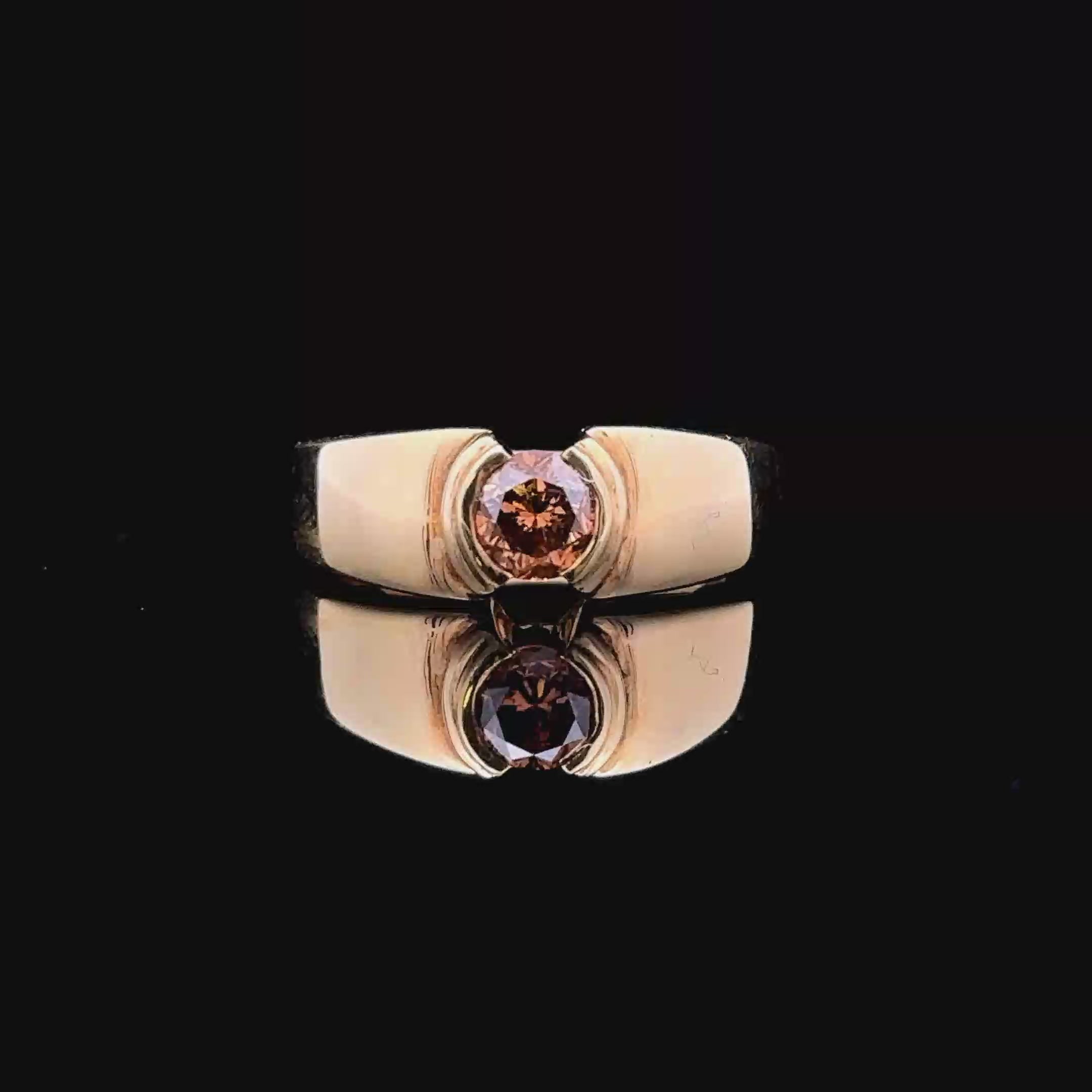 The Becky Ring, designed by Kathryn for Veleska Jewelry, showcases a striking .57 carat cognac diamond in a unique half bezel setting. Crafted in 18K yellow gold, this ring combines modern sophistication with bold color, creating a statement piece that's perfect for any occasion. Its warm cognac diamond beautifully contrasts with the gold setting, making it a distinctive addition to your jewelry collection.
