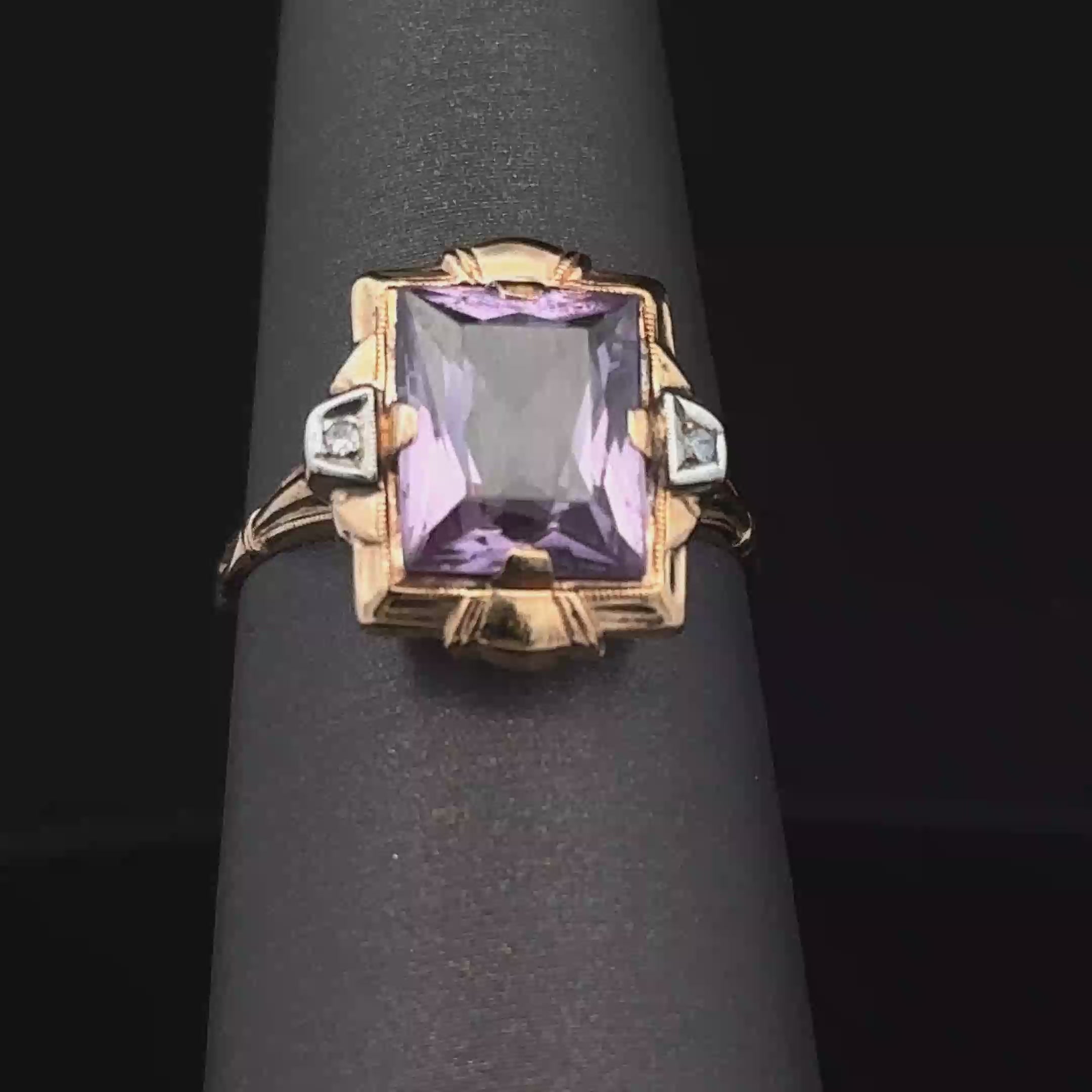 The Brylee Ring is a beautiful piece that encapsulates the charm and elegance of vintage style. This ring features a purple glass centerpiece, with a regal purple hue, which radiates from within a classic 14K yellow gold setting. The glass is enhanced by the subtle shimmer of diamond accents, which add a layer of sophistication and allure to the design. This ring is a celebration of traditional aesthetics blended with modern craftsmanship.