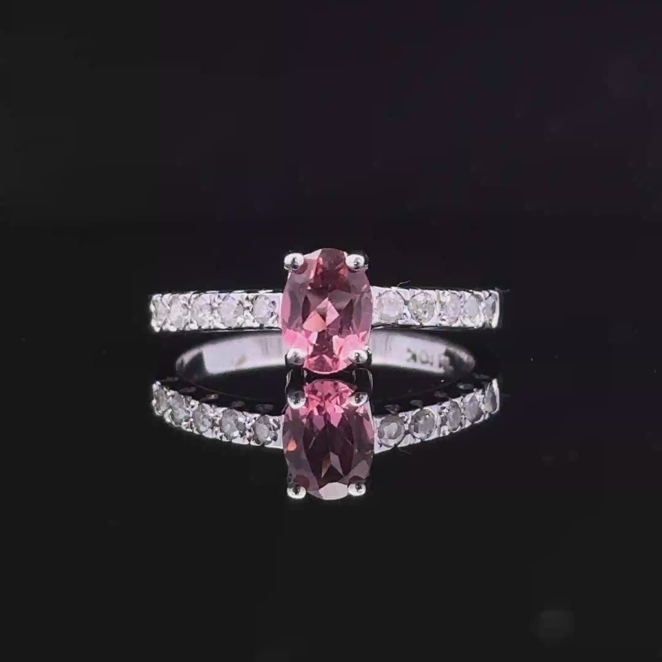 The Calliope ring offers a modern touch of elegance, featuring a stunning 7x5mm oval pink tourmaline accented by nine sparkling round diamonds totaling 0.09 carats. Set in sleek 10-karat white gold with a delicate 2mm band, this piece is a chic and timeless addition to your collection.