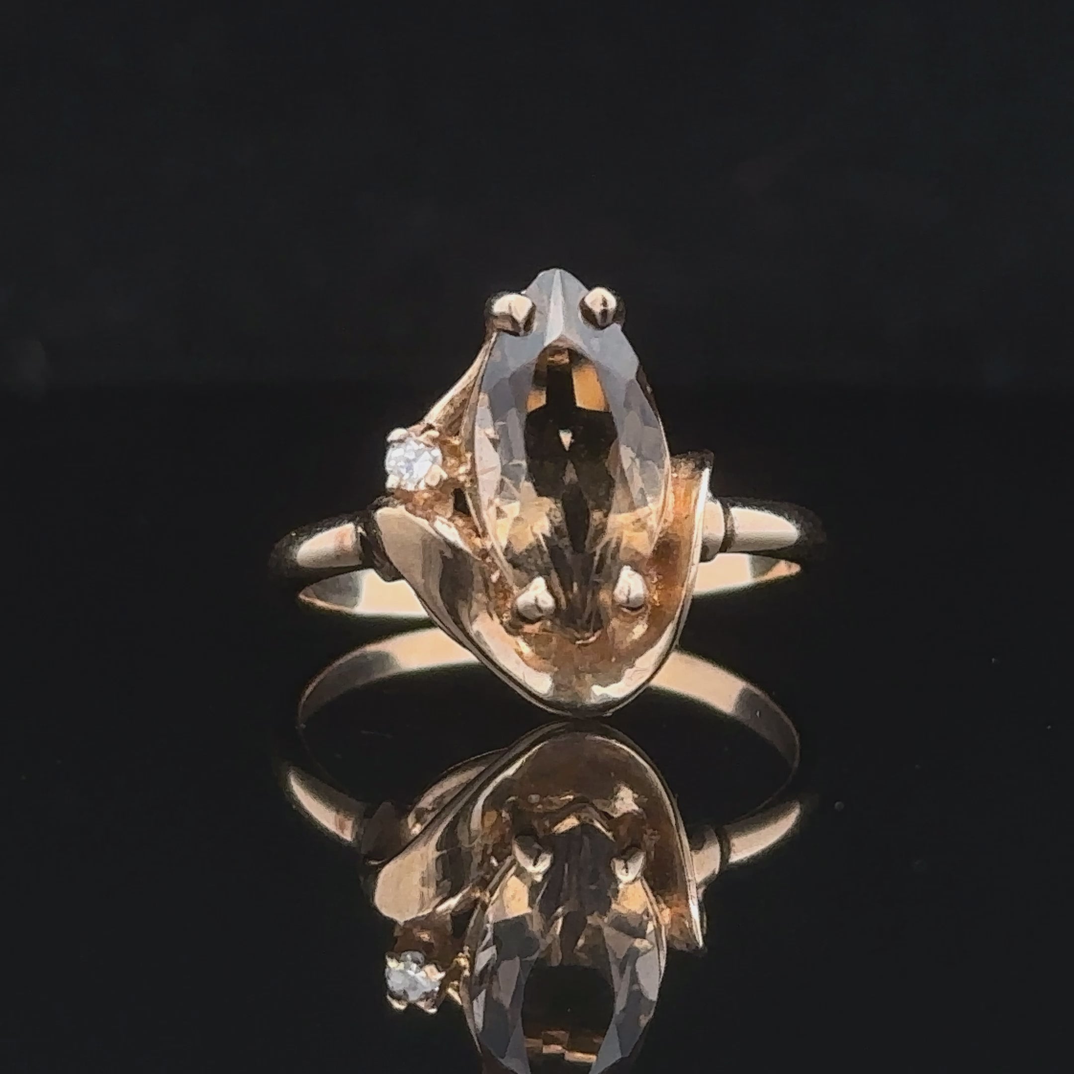 The Camille ring in yellow 10K gold captures the elegance of the Art Deco era with its sleek design. This size 6.5 ring features a striking 12.00x6.00mm marquise smoky quartz as its focal point, paired with a delicate 1.50mm round diamond. The 1.5mm wide band adds to the ring's refined look, making it a perfect choice for those who love vintage-inspired jewelry with a modern twist.