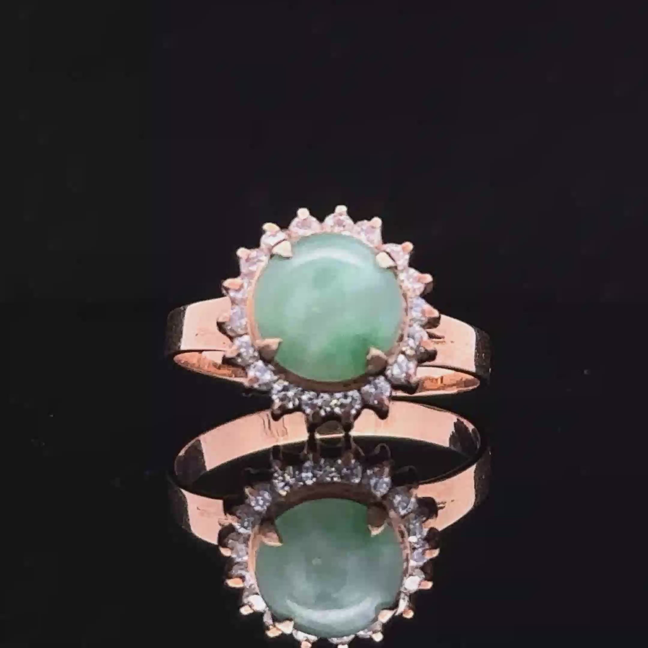 Corinne Yellow 18 Karat Polished Fashion Ring with Cabochon Jade and Diamond Halo