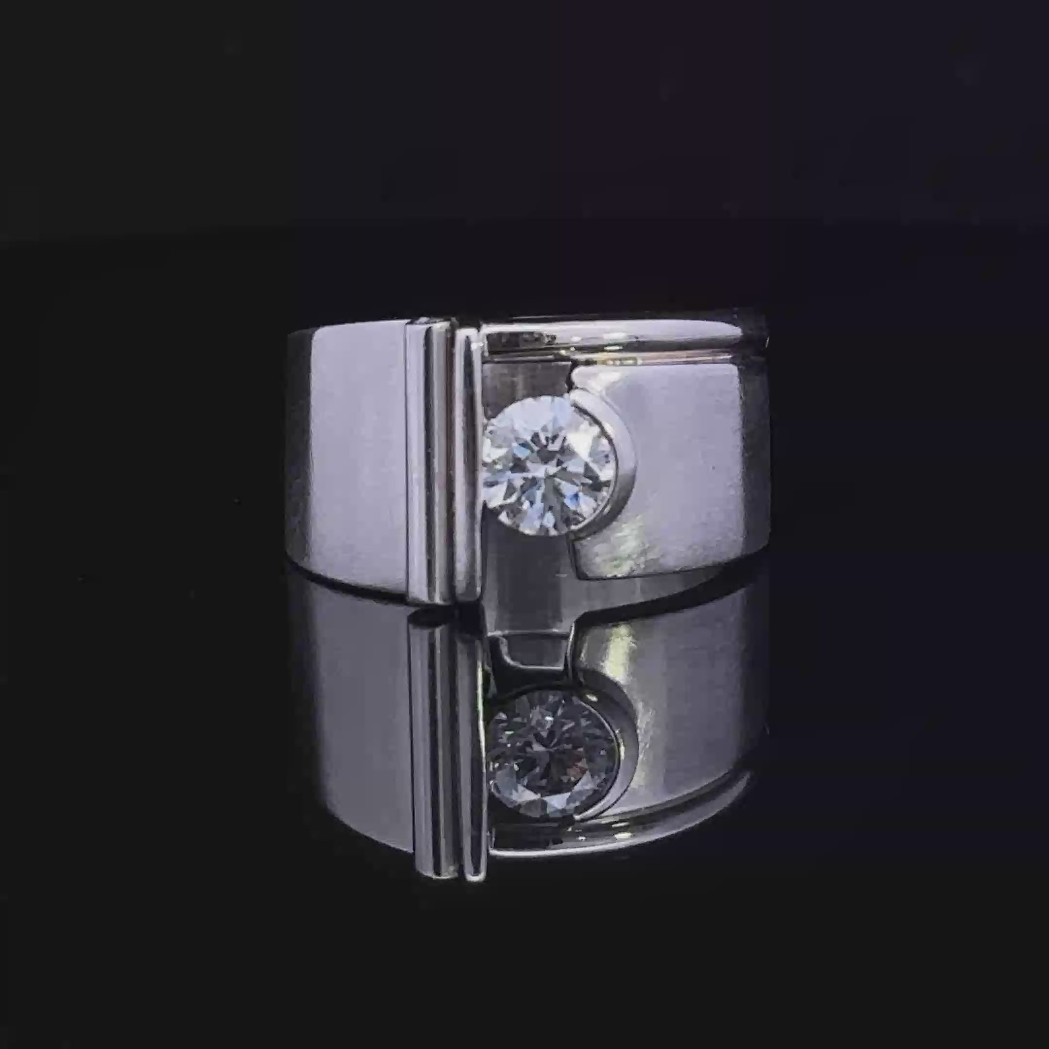 Introducing the Daleyza Ring from Veleska Jewelry, a perfect blend of modern sophistication and classic allure. The ring is crafted in high-quality platinum, chosen for its strength and lasting brilliance. This exquisite piece features a .71 carat center diamond, boasting an F color and SI2 clarity, ensuring a stunningly clear and bright appearance. The center stone is elegantly secured in a half bezel setting, highlighting its radiant cut and brilliance without overshadowing its natural beauty. Complementing the central diamoind are two side stones,totaling .02ctw with an F color and VS1 clarity, enhancing the sparkle with their exceptional purity. Starting at a substantial 7mm, tapers gently, providing a comfortable fit while enhancing the ring's sleek and stylish appearance.