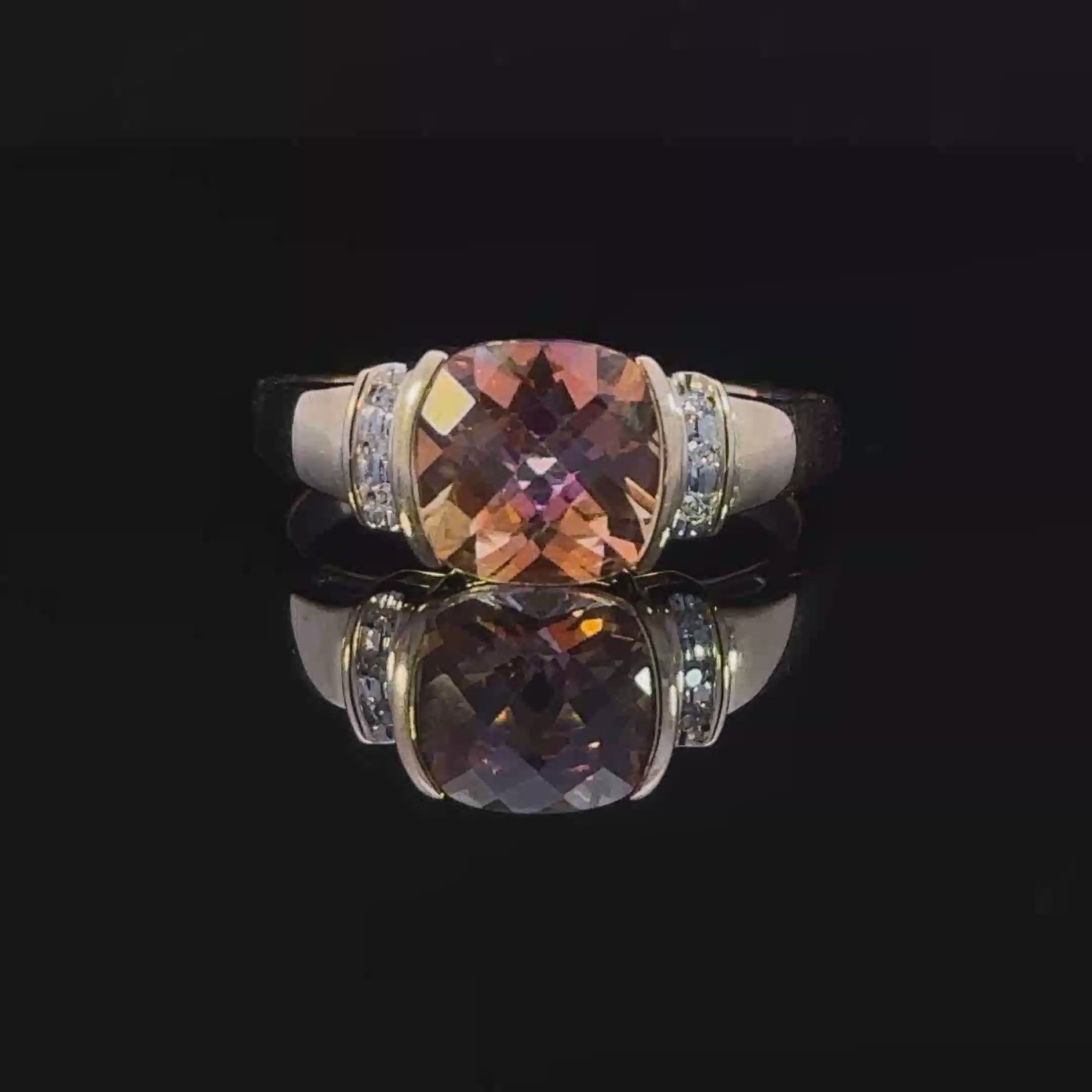 The Ellie Ring from Veleska Jewelry captures the essence of a warm sunrise with its vibrant centerpiece and contemporary design. Set in 10 karat yellow gold, this ring features a stunning 3.50ct Sunrise Topaz, known for its radiant orangy-yellow color that evokes the early morning sky. The topaz's large size and vivid hue make it a true statement piece, perfect for those who seek jewelry that not only accessorizes but also captivates. Complementing the bold topaz are six small diamonds, totaling 0.03 carats, which add a subtle sparkle to the ring, enhancing the brilliance of the central stone without overshadowing its natural beauty. This thoughtful arrangement of diamonds brings a touch of luxury and refinement to the ring's overall appearance. The Ellie Ring is a testament to modern elegance, combining a standout centerpiece with the timeless appeal of yellow gold. Whether it's for a special occasion or everyday wear, this ring promises to bring a touch of the sunrise's warmth and beauty to your hand.
