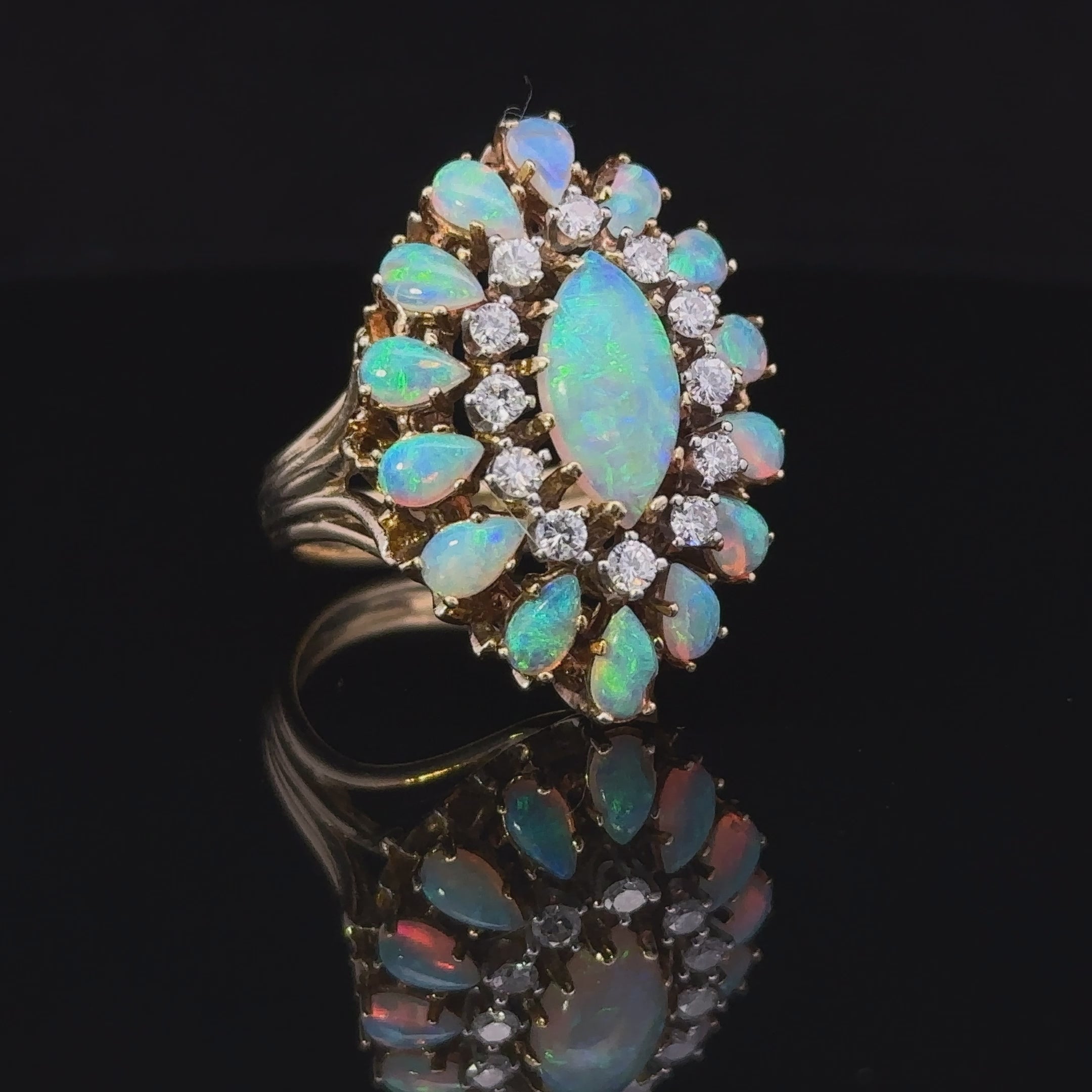 The Ezra ring is a breathtaking piece crafted in two-tone 18K gold, featuring a stunning 0.95-carat marquise blue/green opal as its centerpiece. Surrounding the central opal are 14 pear-shaped blue/green opals, totaling 2.10 carats, along with additional stones weighing 0.72 carats. This ring, with its 4mm band width, combines the vibrant hues of opals with the brilliance of diamonds, creating an exquisite and luxurious design. Perfect for those who appreciate unique and opulent jewelry, the Ezra ring is a true statement piece.