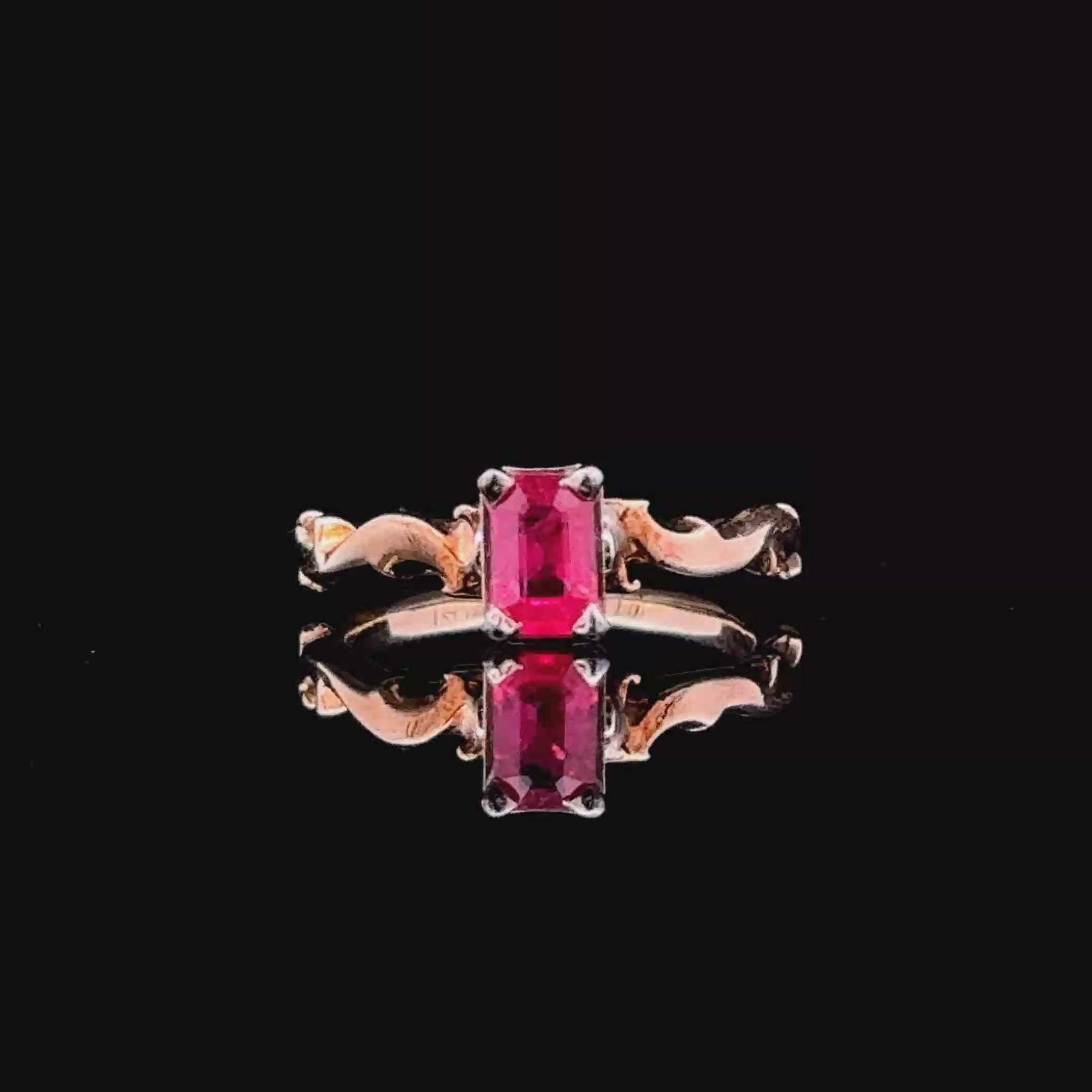 The Florentina ring in 14K yellow gold features a striking emerald-cut ruby, accentuated by an elegant Florentine side design. A timeless and sophisticated statement piece.