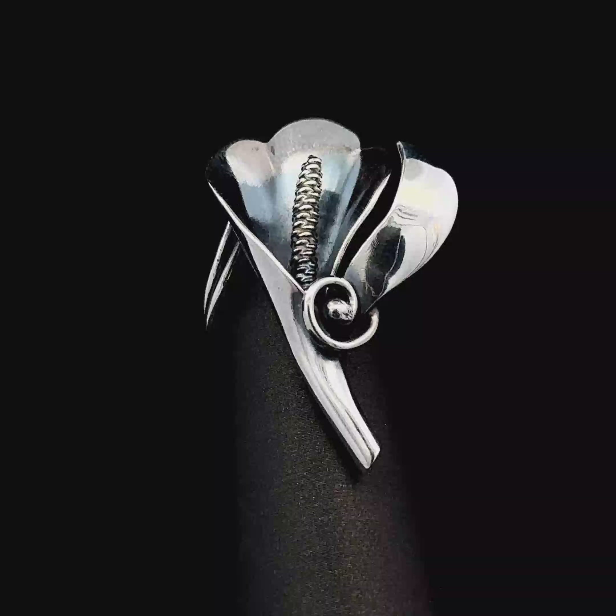 This Folmere Denmark artisan ring showcases a beautifully polished antiqued silver design with a delicate floral motif. Crafted with intricate detailing, this designer piece embodies elegance and craftsmanship, making it a timeless addition to any collection.