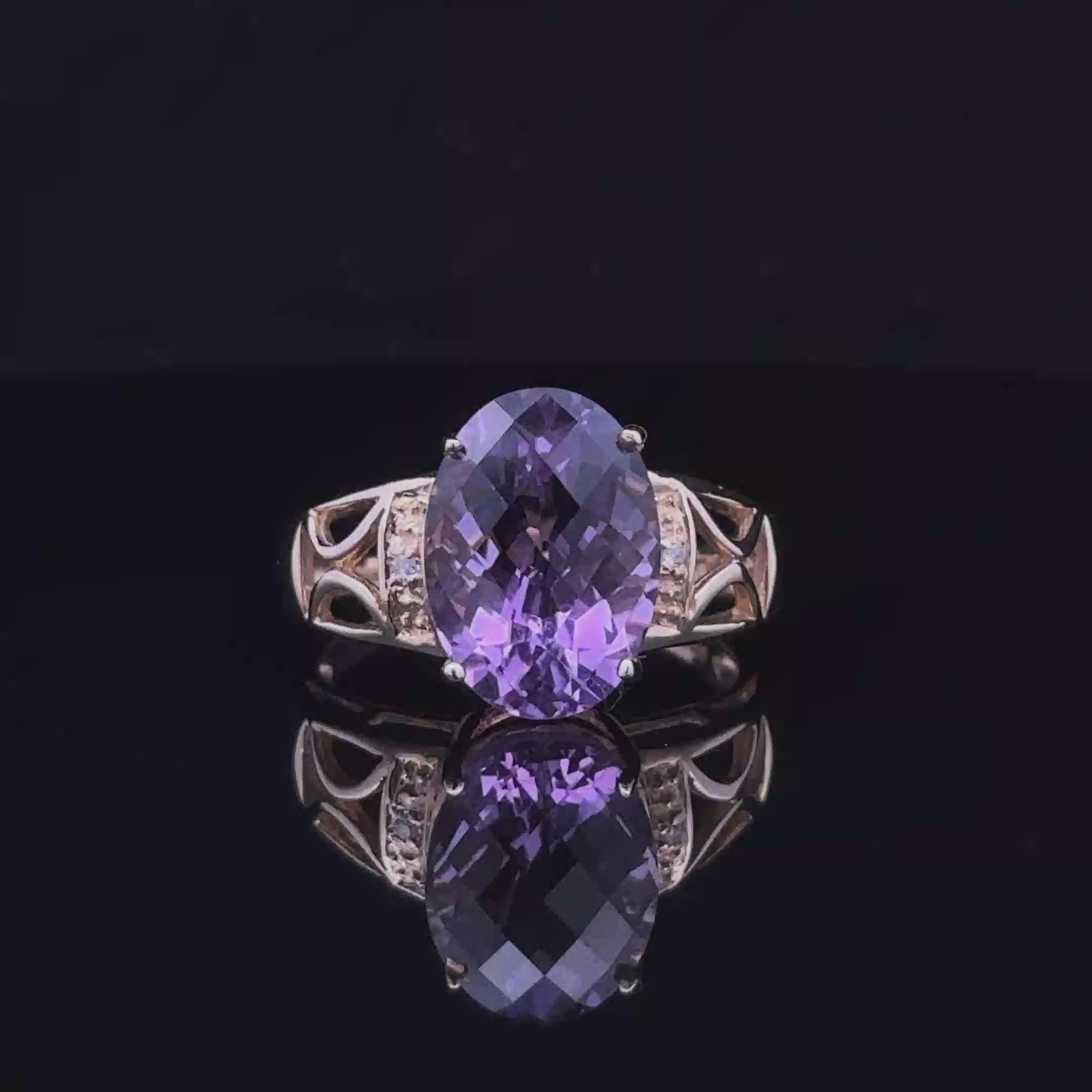 At its heart is a captivating amethyst, known for its vibrant purple hue. Sparkling accent diamonds complement the center stone, adding brilliance and sophistication. The contrast between the amethyst and diamonds against the warm yellow gold makes this ring a unique and eye-catching accessory. The Giuliana ring offers a comfortable and perfect fit, making it an ideal choice for treating yourself or a loved one.