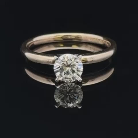The Grace Ring from Veleska Jewelry encapsulates brilliance and elegance, designed to catch the light and attention at every turn. This exquisite ring combines the warm tones of 14K yellow gold with the sleekness of a platinum head, creating a stunning visual contrast that enhances the overall appearance of the diamond. At the heart of the Grace Ring lies a .72 carat round brilliant cut diamond, graded SI2 for clarity and H for color, offering exceptional sparkle and a clean look. This solitaire diamond is expertly set in a secure platinum head, ensuring both durability and a lustrous highlight to the stone's natural brilliance, the ring makes a bold statement while maintaining a sophisticated profile.
