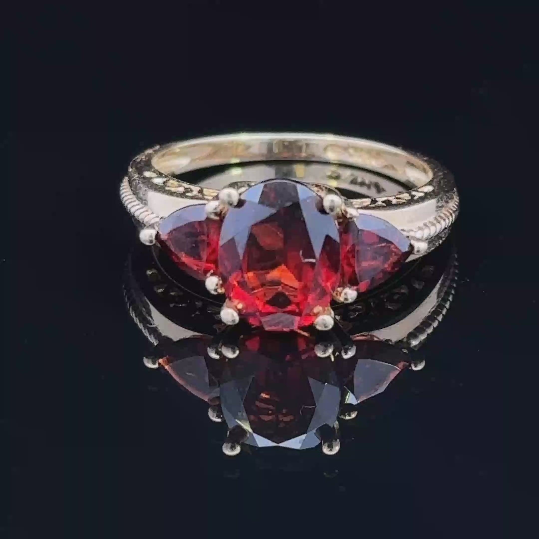 The Iris 3-Stone Fashion Ring features a rich 8x7mm oval red garnet, flanked by two 4x3mm trillion-cut garnets in warm 14K yellow gold. A timeless design with bold color.
