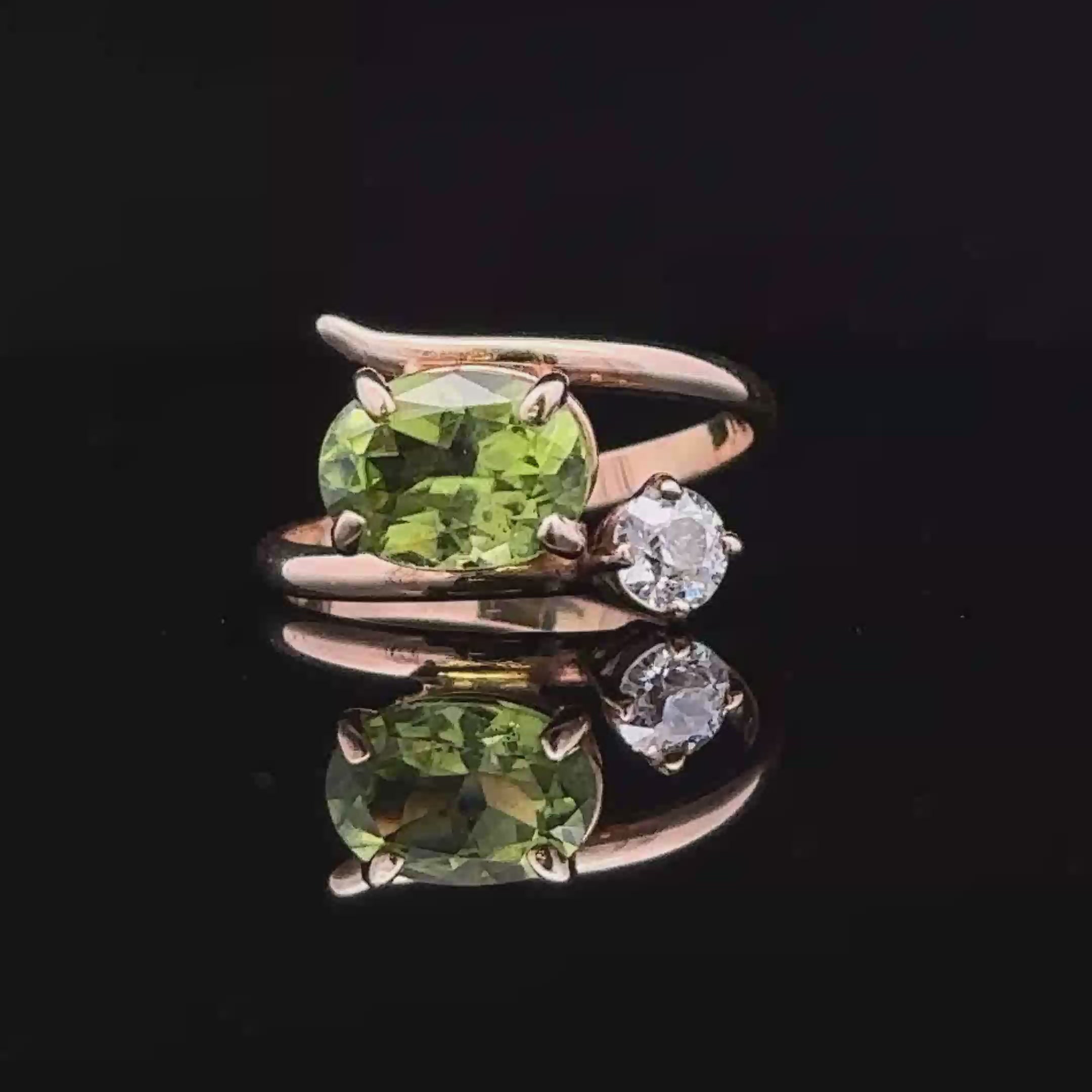 The Isla Art Deco Ring showcases an 8x6mm oval green peridot paired with a dazzling 0.25-carat round diamond. Set in polished 14K yellow gold, this ring combines vintage-inspired charm with radiant elegance, perfect for making a unique statement.