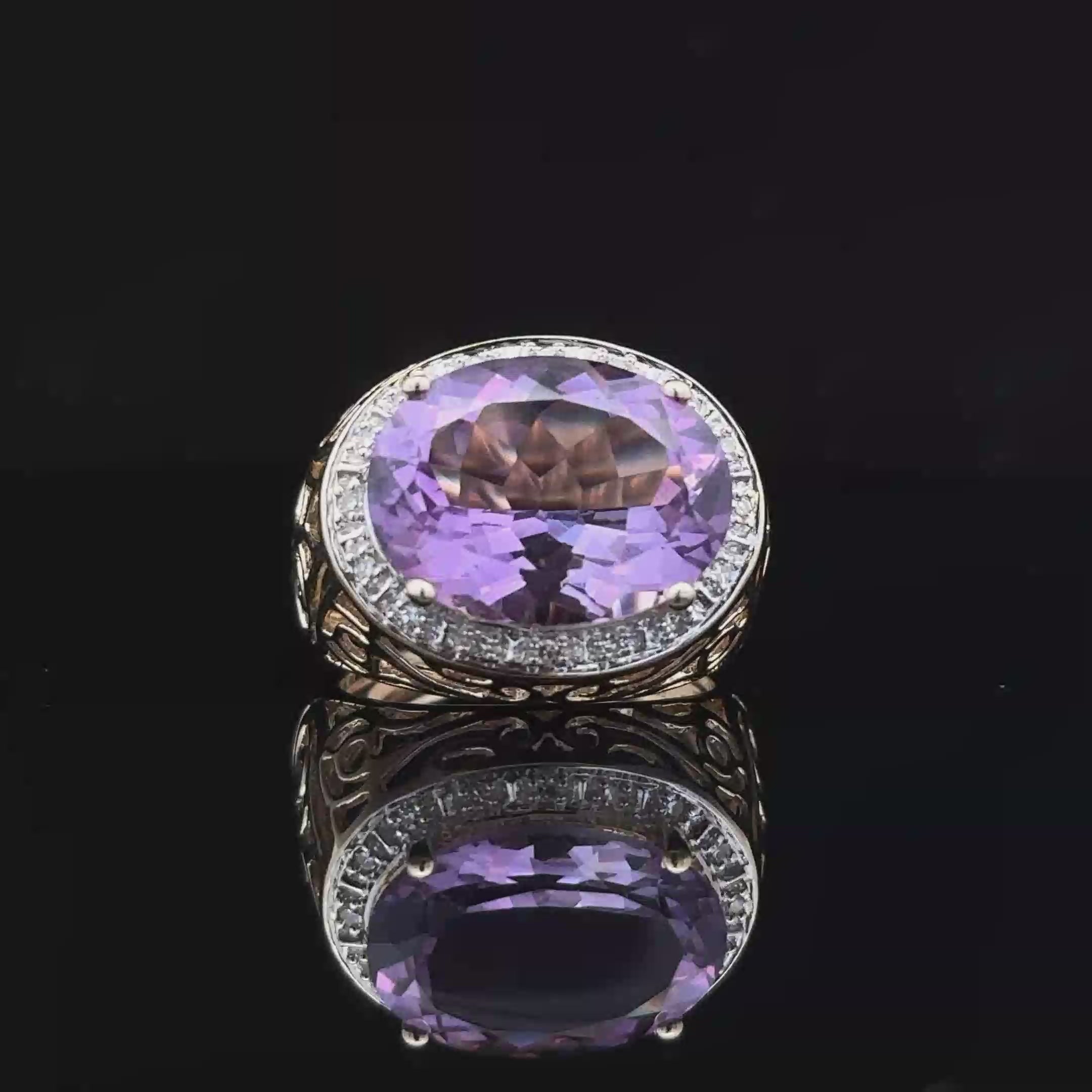 The Jaycee fashion ring combines two-tone 14K gold with an intricate filigree design, showcasing a captivating 8.00ct oval purple amethyst as its centerpiece. The ring is further enhanced by 16 sparkling single cut I1 diamonds, totaling 0.08ct, adding a delicate touch of shimmer. With a vintage style and 3.89mm width, this ring blends boldness and elegance, offering a timeless look that’s perfect for special occasions or everyday luxury.