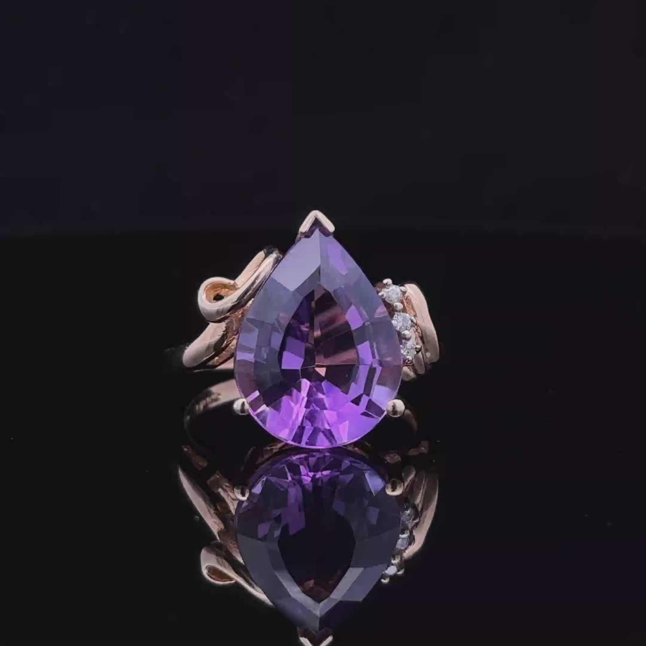 Introducing Kailani, This ring features a captivating 1.65-carat pear-shaped amethyst, radiating a deep, enchanting purple hue. The centerpiece is beautifully complemented by three round diamonds, adding a touch of sparkle and sophistication.
