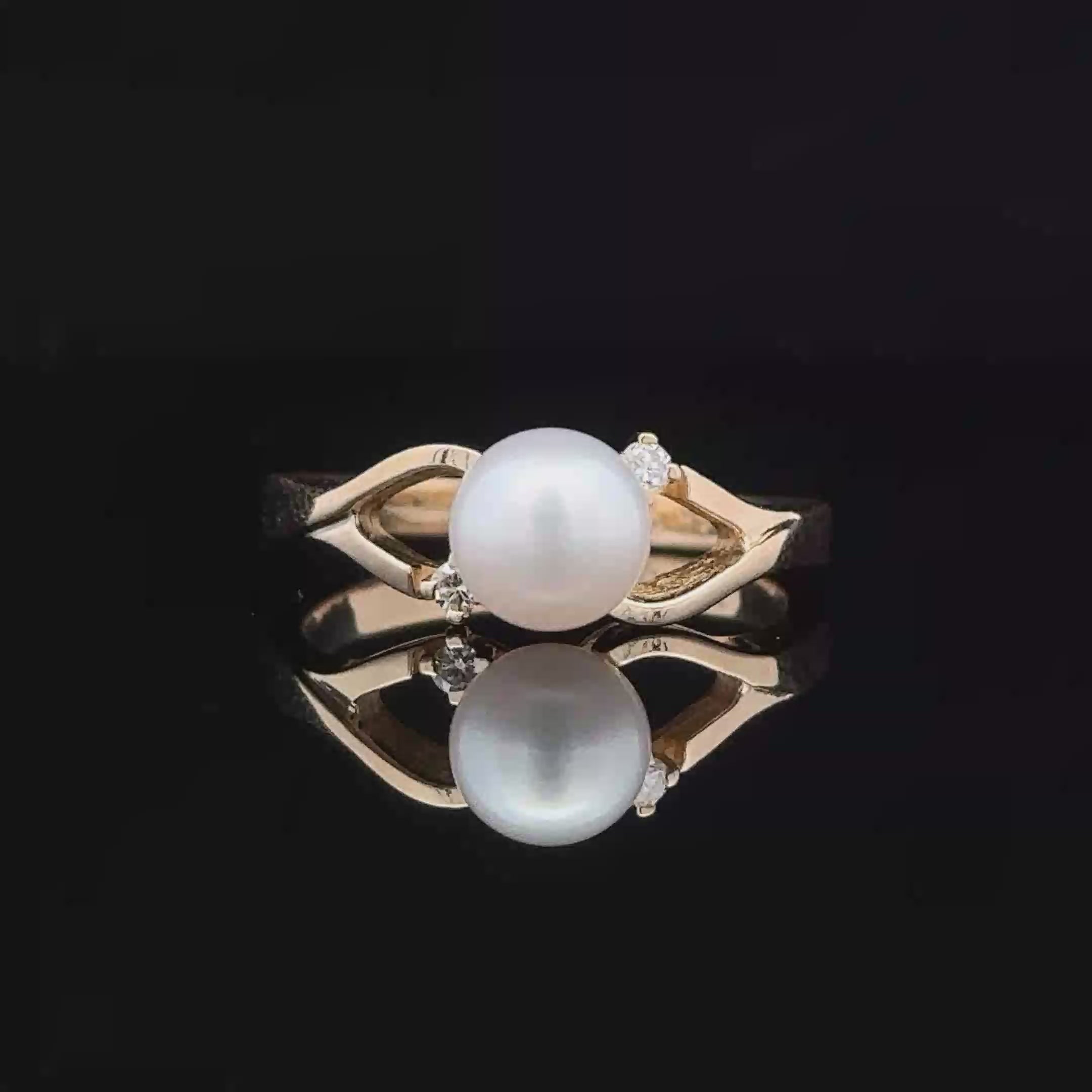 The Amayah 14K Yellow gold ring showcases a stunning 7.00mm round white pearl, accented by two brilliant round diamonds totaling 0.03ct. This ring is perfect for adding a touch of refined beauty to any occasion. The contrast of the bright white pearl and sparkling diamonds creates a graceful and timeless look.