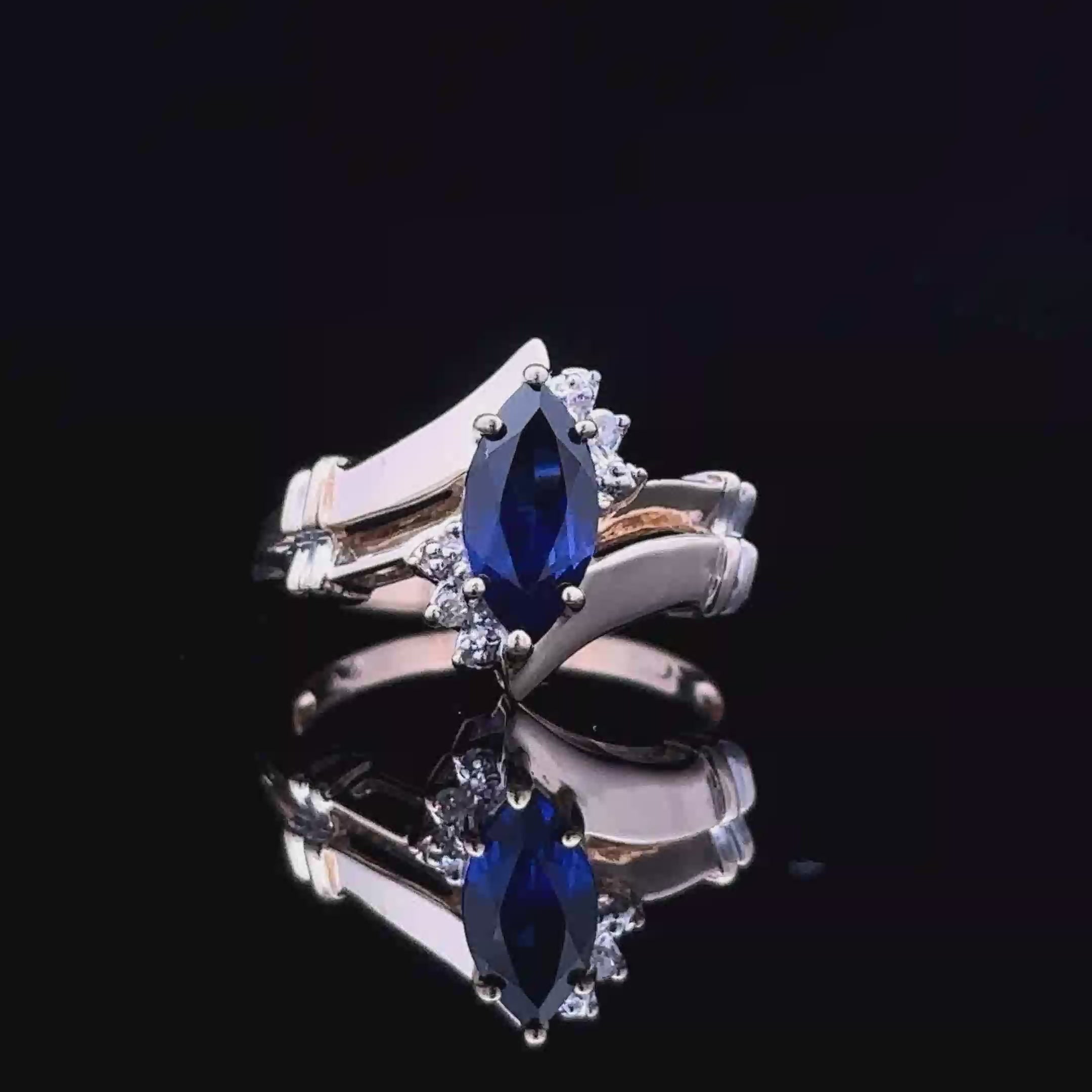 The Kathy ring features a 1.40ct marquise lab-grown blue sapphire set in a two-tone 10K gold design, accented by delicate rose-cut diamonds.