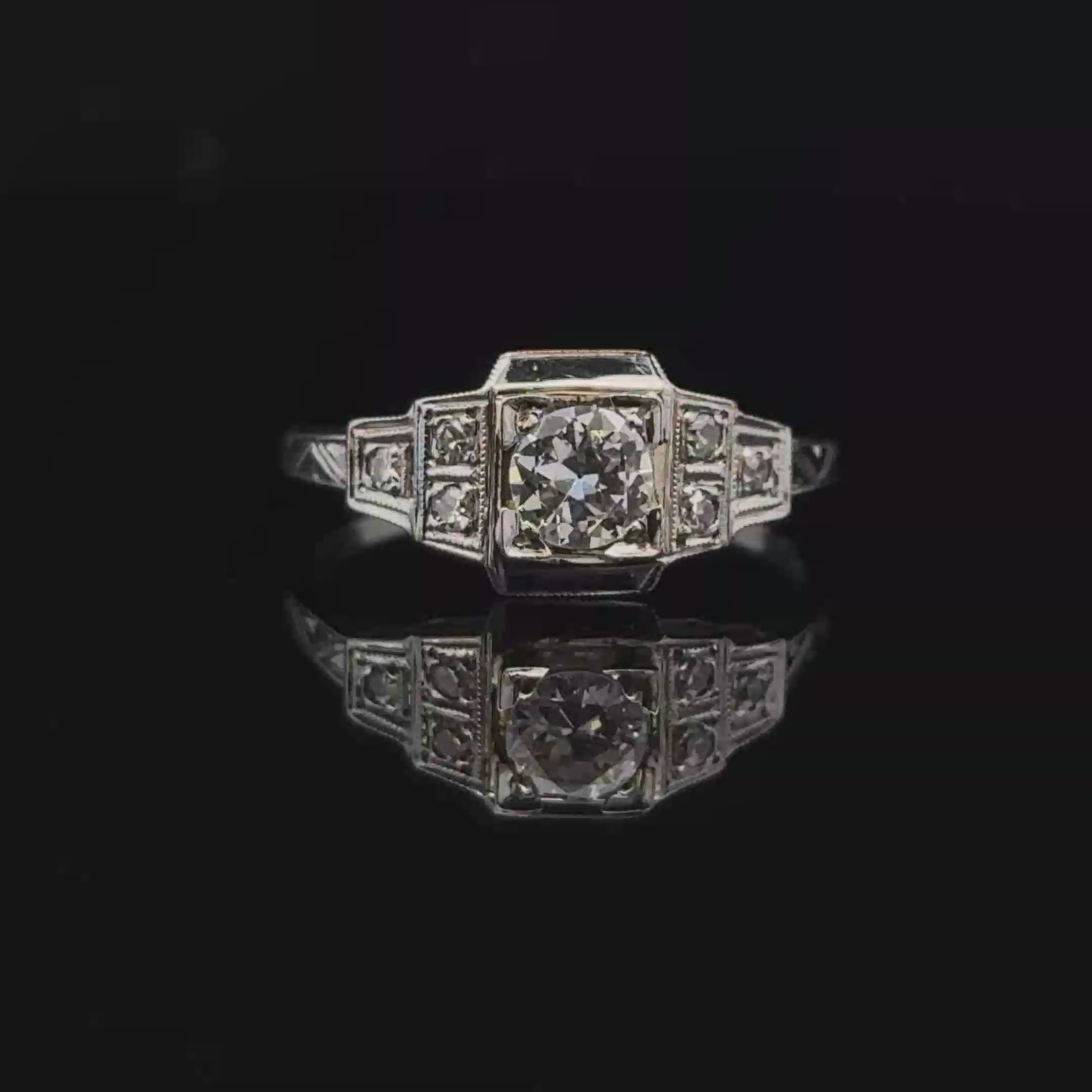 The Kennedy White 18 Karat Engagement Ring combines estate-style elegance with a modern touch. Featuring a 0.40-carat Euro-cut G VS2 center diamond, surrounded by six accent diamonds totaling 0.09 carats, this ring boasts a slim 1mm band that enhances its graceful design. A timeless piece for cherished moments.